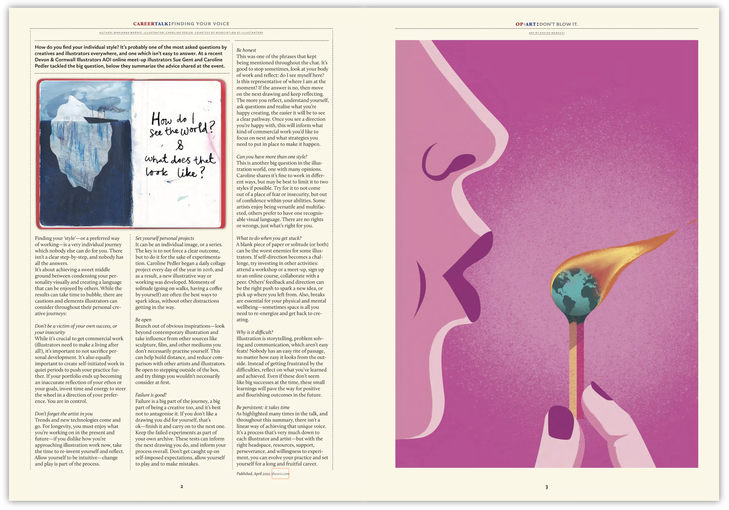In 2021 fellow illustrator and now friend, Sue Gent and I did a podcast episode for the Association of Illustrators. It was about finding your voice as an illustrator, being that both of us had had extensive careers up to that point and therefore had a lot of experiences with and without clients calling the shots. I felt compelled to share again the accompanying text to the podcast, that was written up into an article for 3X3 Magazine by the AOI’s very own Marianna Madriz. We don’t have access to the podcast anymore but this article covers the main points.